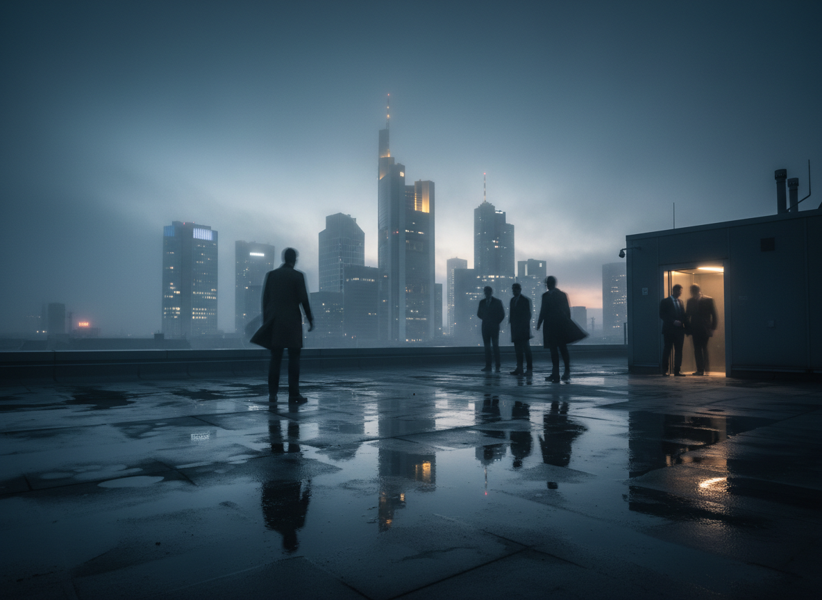 Er saß am Küchentisch, das Licht aus, nur das Display seines Laptops als blasse Fläche in der Dunkelheit. Frankfurt draußen war ein schwarzes Meer, in dem die Türme wie Bojen standen. Er hörte den Kühlschrank anspringen, hörte die Heizung klicken, hörte seine eigene Atmung – und merkte, dass er auf Geräusche wartete, die nicht kommen mussten, um real zu sein.